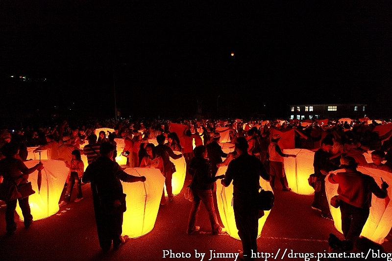 開始施放天燈啦!每個天燈都是兩個人一組的喔!然後每顆天燈會有一位志工協助!點燃天燈的會有另一位工作人員幫忙點燃!放天燈的人只要把天燈扶好,等總指揮一聲令下,放開天燈,就會有200顆天燈齊放上天囉!