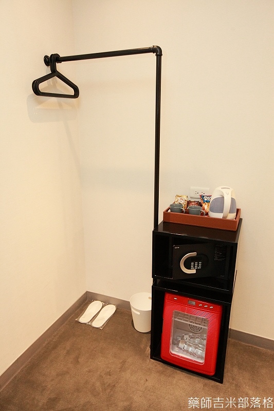 有掛衣服的衣架,像是水管般的設計,也有保險箱